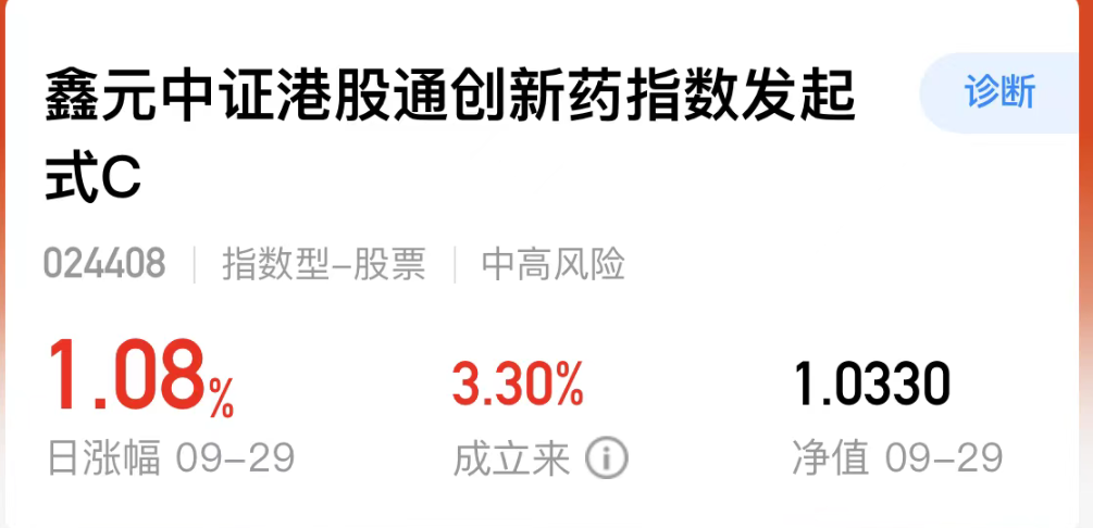 今天大科技涨的不错,但创新药也没有拖后腿,午后触底反弹,收盘翻红了!$鑫元中证港股通创新药指数发起式C(OTCFUND|024408)$净值更新+1.08%,涨势不错,港股创新药的弹性还是挺大的,接下来继续看好这个方向!