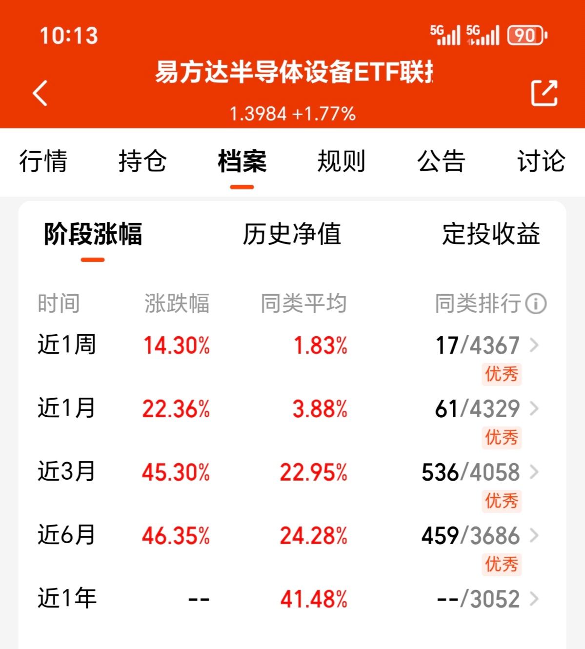 今日A股市场仍然火热不断,创业板指涨超1%,而大科技赛道再次带来领涨趋势,其细分领域半导体设备再次上涨,近期走势非常猛,以$易方达半导体设备ETF联接C(OTCFUND|021894)$来说,近一周涨幅近15%,近一个月涨幅22.36%,业绩排名十分出色,在芯片板块里收益,同时这款基金聚焦半导体设备行业指数,在当下也是利好不断,如华为发布后期昇腾芯片在2026年产量需求大,设备企业有望拿到大单子,我觉得后市前景十分值得可期,先慢慢定投起来了!