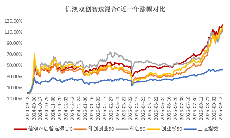 我们家提供了对标科创创业50指数的基金产品-信澳双创智选混合C(018986 中高风险),这只产品运用了AI量化+机器学习等手段,聚焦科创创业50,科创板+创业板两手抓,近1年涨幅跑赢科创创业50指数超8%,跑赢科创50指数超11%,跑赢创业板50指数超3%,跑赢大盘超80%。欢迎大家关注!