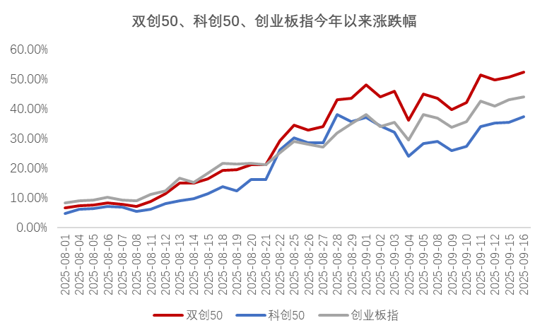 科创创业50指数从科创板和创业板中选取市值较大的50只新兴产业上市公司证券作为指数样本,以反映科创板与创业板中代表性新兴产业上市公司的整体表现。该指数汇聚了两大板块的龙头企业,涵盖新一代信息技术、高端装备制造、新材料、生物产业等新兴行业。2025年8月下旬以来,科创创业50指数走势显著优于科创50和创业板指。截至9月16日,双创50指数今年以来上涨52.43%,涨幅超越科创50指数15.11%、超越创业板指8.25%。整体来说,科创创业50指数呈现出了更加强劲向上的收益曲线。(iFinD ,2025.9.16)