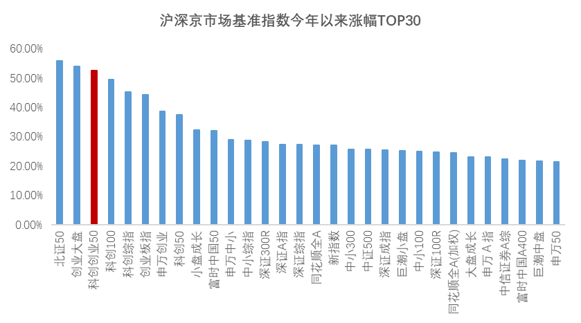当全球竞争格局重塑,科技创新正成为大国博弈的主战场。在科技投资热潮中,投资者常面临选择困境:到底是投资科创板,还是投资创业板?其实,不妨考虑第三条路——中证科创创业50指数(简称:科创创业50,代码:931643)。这一只囊括科创板、创业板顶级科创公司的科技浓缩版指数,作为汇聚了硬科技与新经济精华的战略高地,正为投资者提供一张驶向未来的头等舱船票。截至2025年9月16日,科创创业50今年以来上涨52.43%,涨幅在沪深京市场基准指数中位居第三。(iFinD ,2025.9.16)