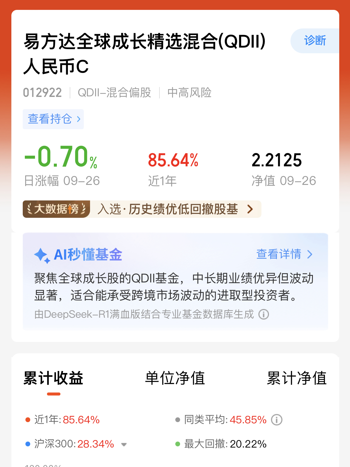 全球AI竞争进入白热化,国内DeepSeek与寒武纪强强联合,美股英伟达、高通也在AI领域重兵布局。要是只盯着A股,容易错失全球技术共振红利。$易方达全球成长精选混合(QDII)人民币C(OTCFUND|012922)$覆盖美中港三地科技资产,可同时布局美股AI巨头、A股算力核心、港股互联网龙头,调仓灵活且长期业绩稳定,近一个月涨幅13.29%,近三个月涨幅41.51%,业绩表现出色,我也继续持有啦!