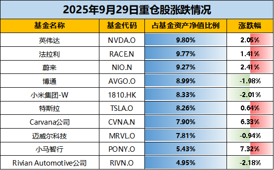 【十大持仓】根据最新披露的基金定期报告,截至2025年二季度末,华宝海外新能源汽车前十大重仓股包括英伟达、法拉利、蔚来、博通、小米集团-W、特斯拉、Carvana公司、迈威尔科技、小马智行、Rivian Automotive公司,占基金资产净值比例合计为80.51%。