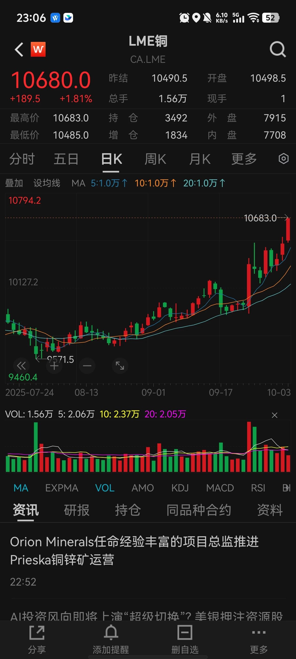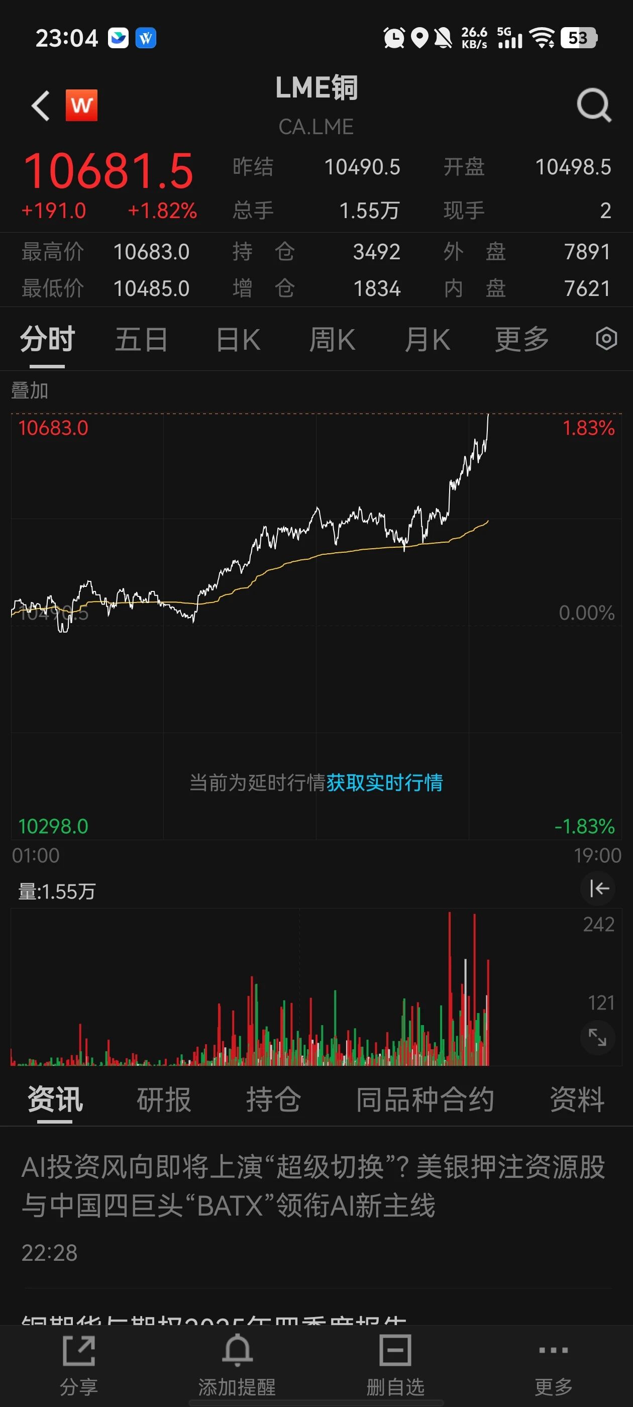 假期美股正常开市,昨晚美股涨得很应景,尤其是资源品板块看了一下,伦铜的价格已经突破了1万美元,走势有一种逼空的感觉。
