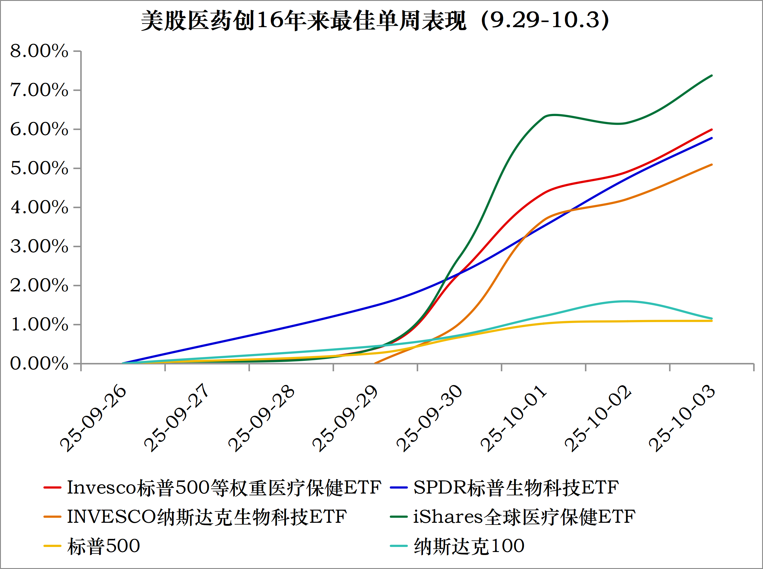 上周(9.29-10.3),美股医药板块创下16年来最好的单周涨幅,表现大幅超越美股宽基指数。