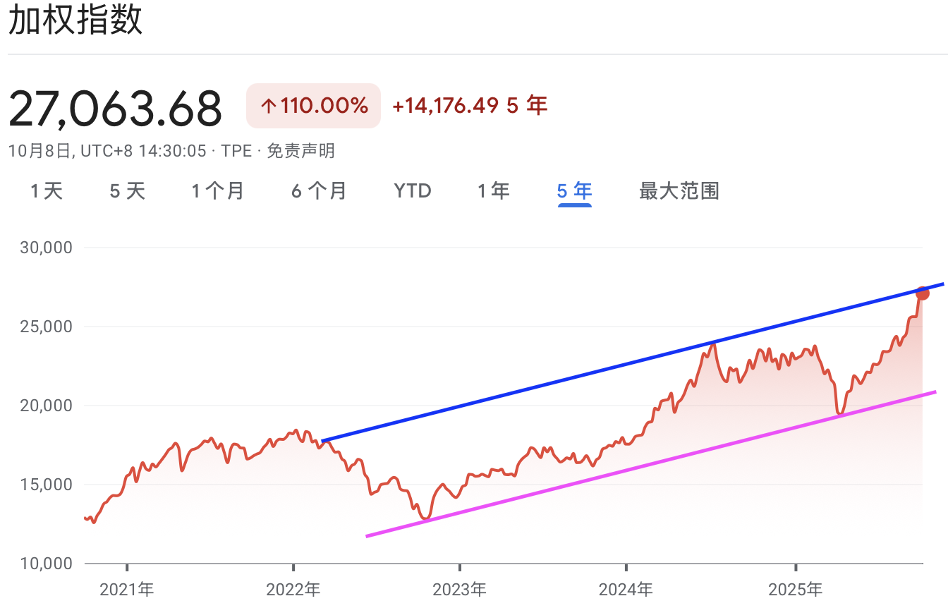 台股加权指数最近突破最高点压力位,一直震荡上行中。最近几日大幅飙升,短期强势上行中,长期期已经涨至压力位。