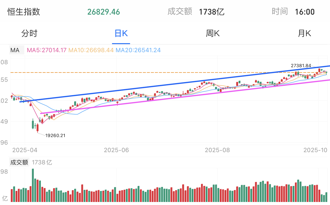 恒生指数周三继续下跌,从趋势看,它近期进入上升通道,这几日受阻于通道压力位并回落,目前仍在通道中震荡上行。