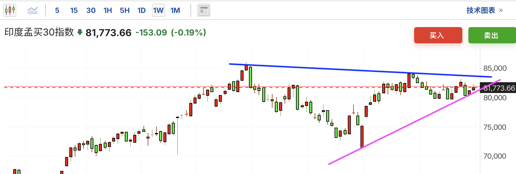 印度指数近期震荡不前,在中间位置形成对称三角形,不确定后市走向,短期在三角形中有回升迹象。