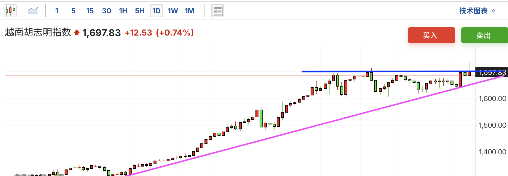 越南指数近期有一波较大行情,最近受阻并进入盘整期,这几日从支撑位反弹至压力位,如果顺利突破,那么再次进入上行模式。