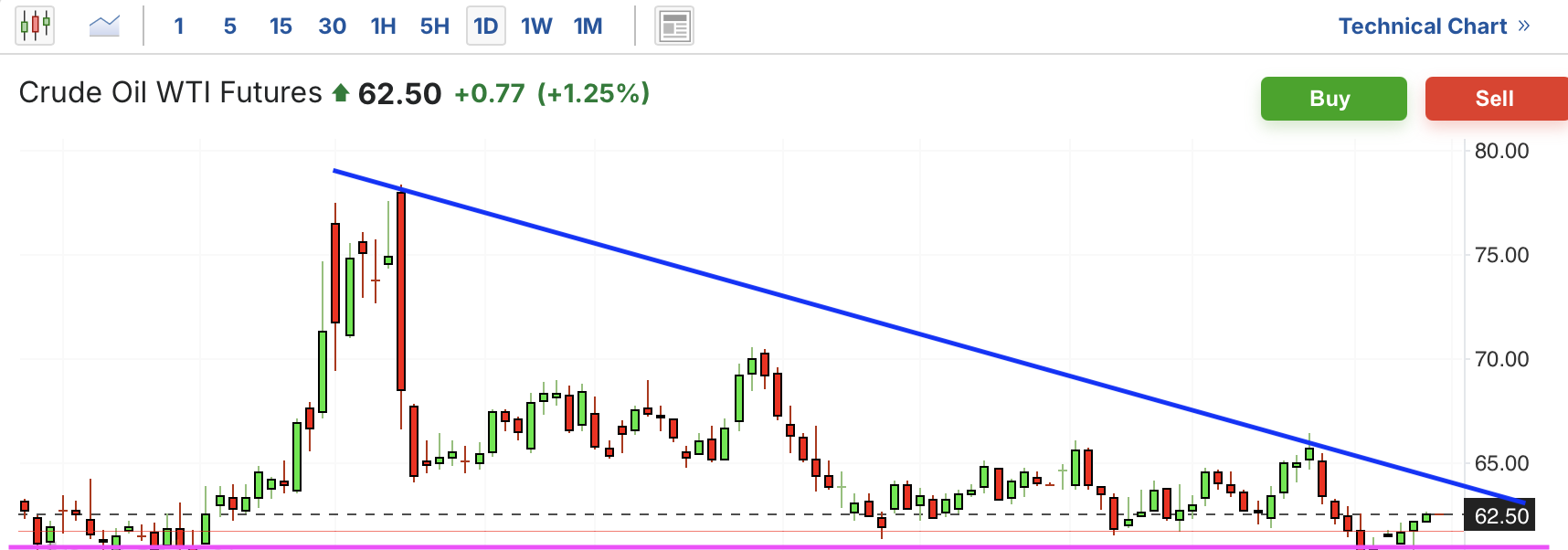 原油最近连续下行,跌至最低点。这两日在支撑位触底反弹,有止跌迹象,但趋势仍下行,还不稳定。