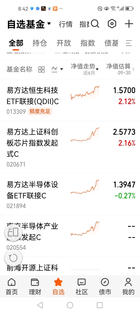 本人看好科技成长板块,持有$易方达科汇灵活配置混合$和$易方达创业板ETF联接A$。今年9月以来,科技板块的投资热潮持续升温,资金并未出现“高切低”的迹象,反而继续集中在科技板块交易。因此,在2025年4季度,本人重点关注$易方达半导体设备ETF联接C$、$易方达上证科创板芯片指数发起式C$、$易方达恒生科技ETF联接(QDII)C$。@易方达基金