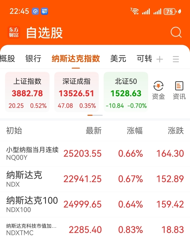 在今天晚上22点45分,观察美股纳斯达克100指数是涨+0..64%