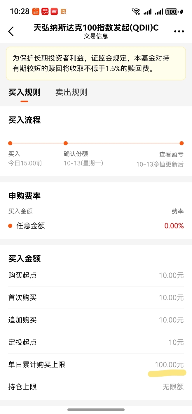 因为观察目前持有的天弘纳斯达克100指数qdll基金,从上个月9月份末的时候,从每天限额1000元,更改成每天限额100元,限额超级太低的缘故的。