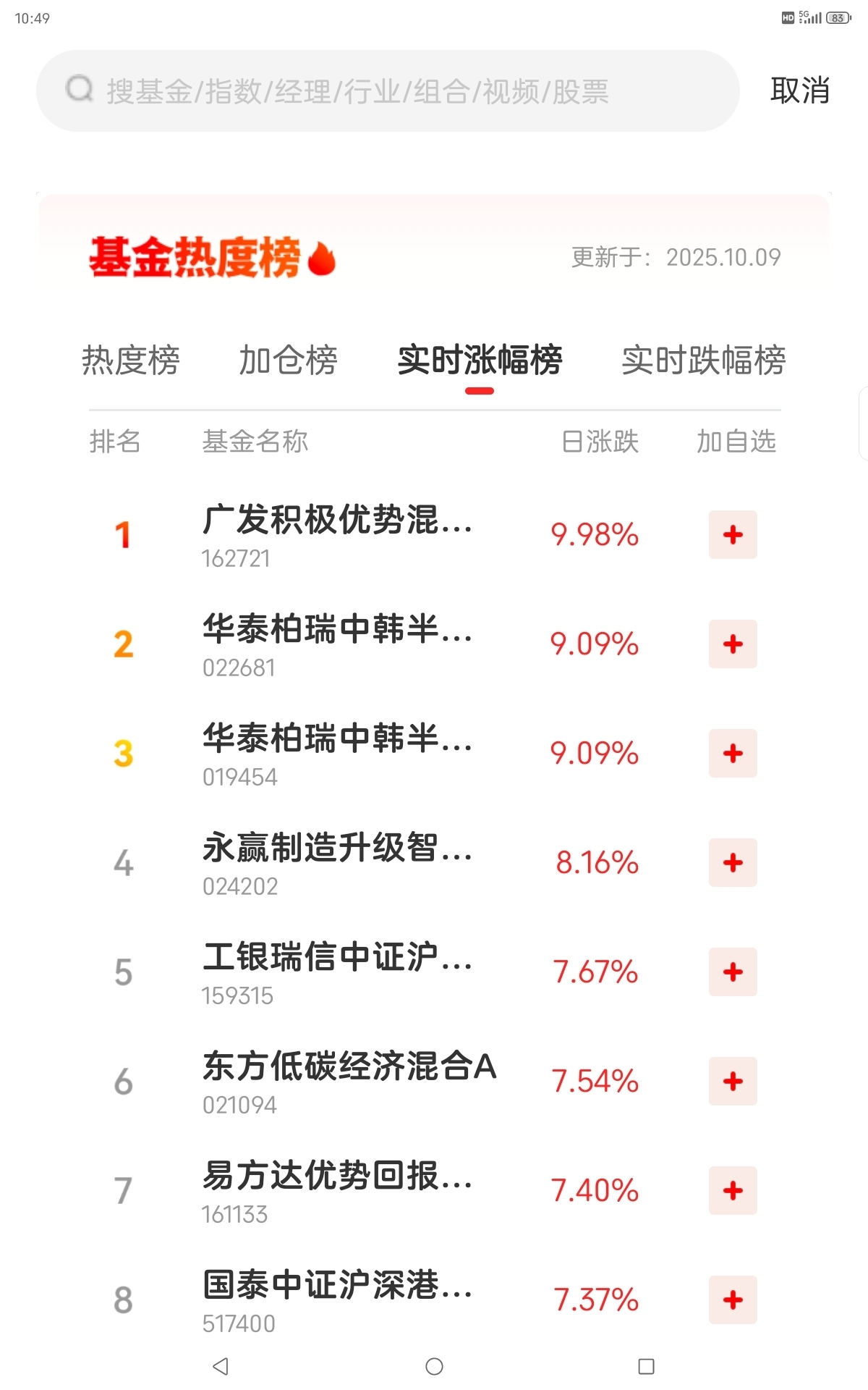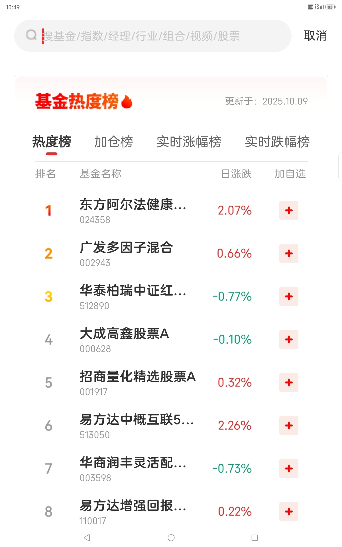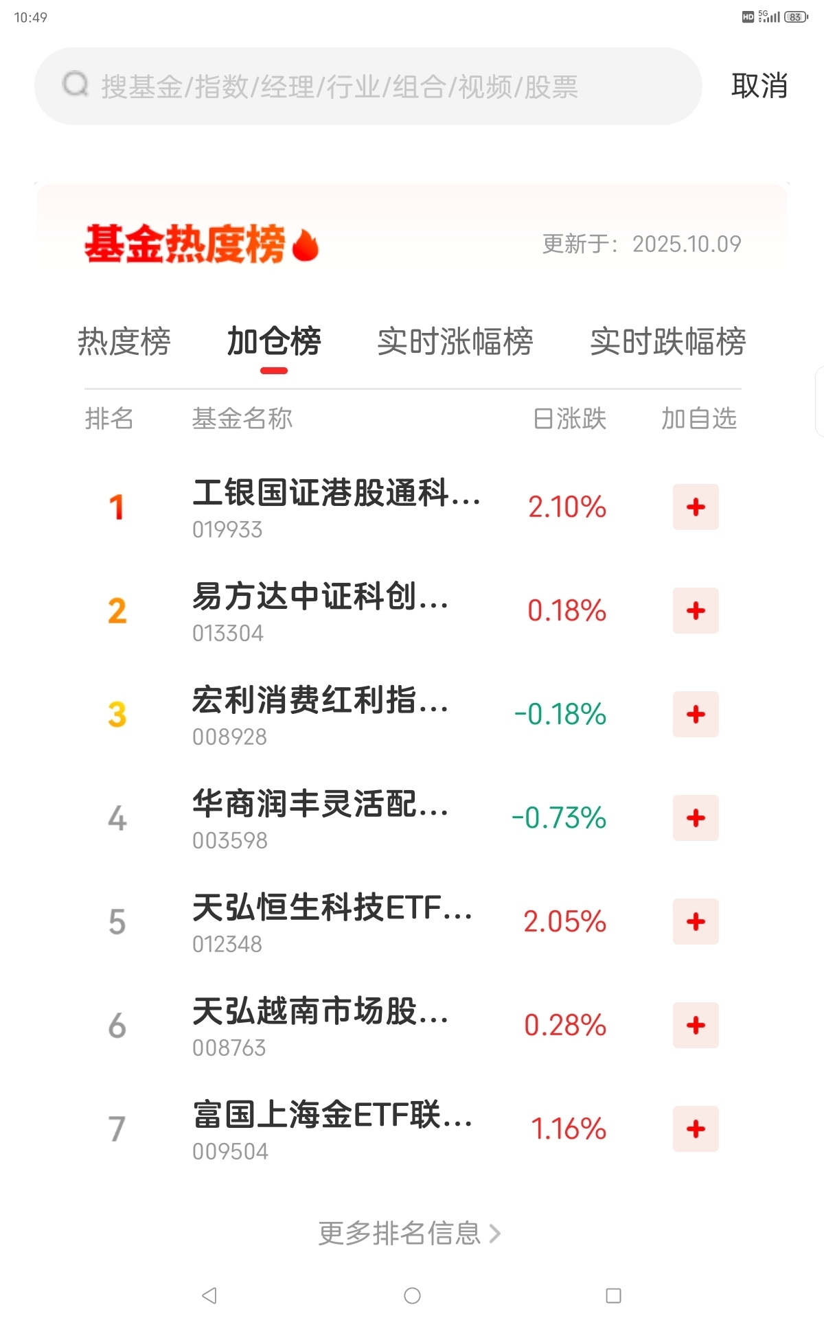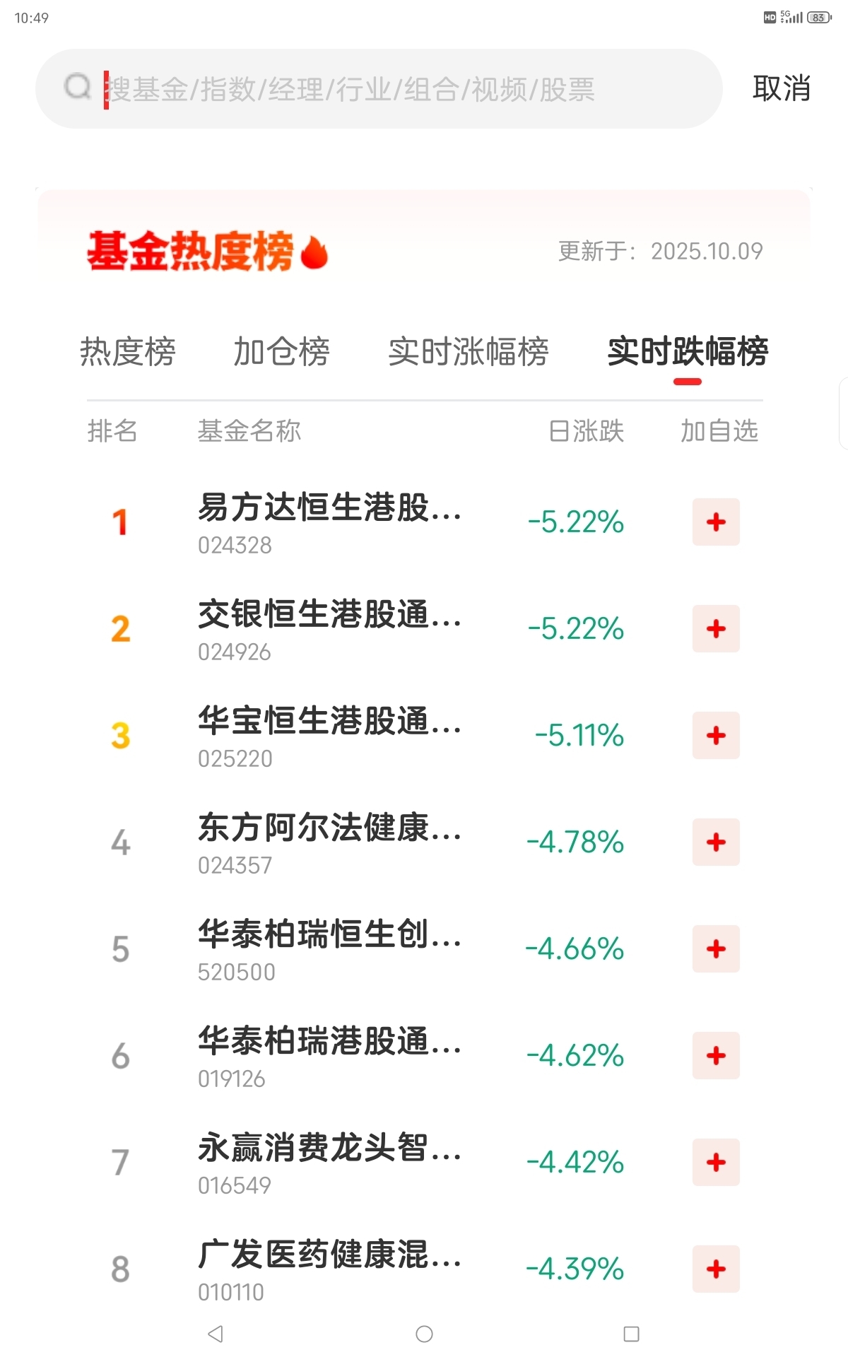 10月9日基金热度榜,加仓榜,实时涨跌幅榜。 芯片大涨;港股创新药大跌