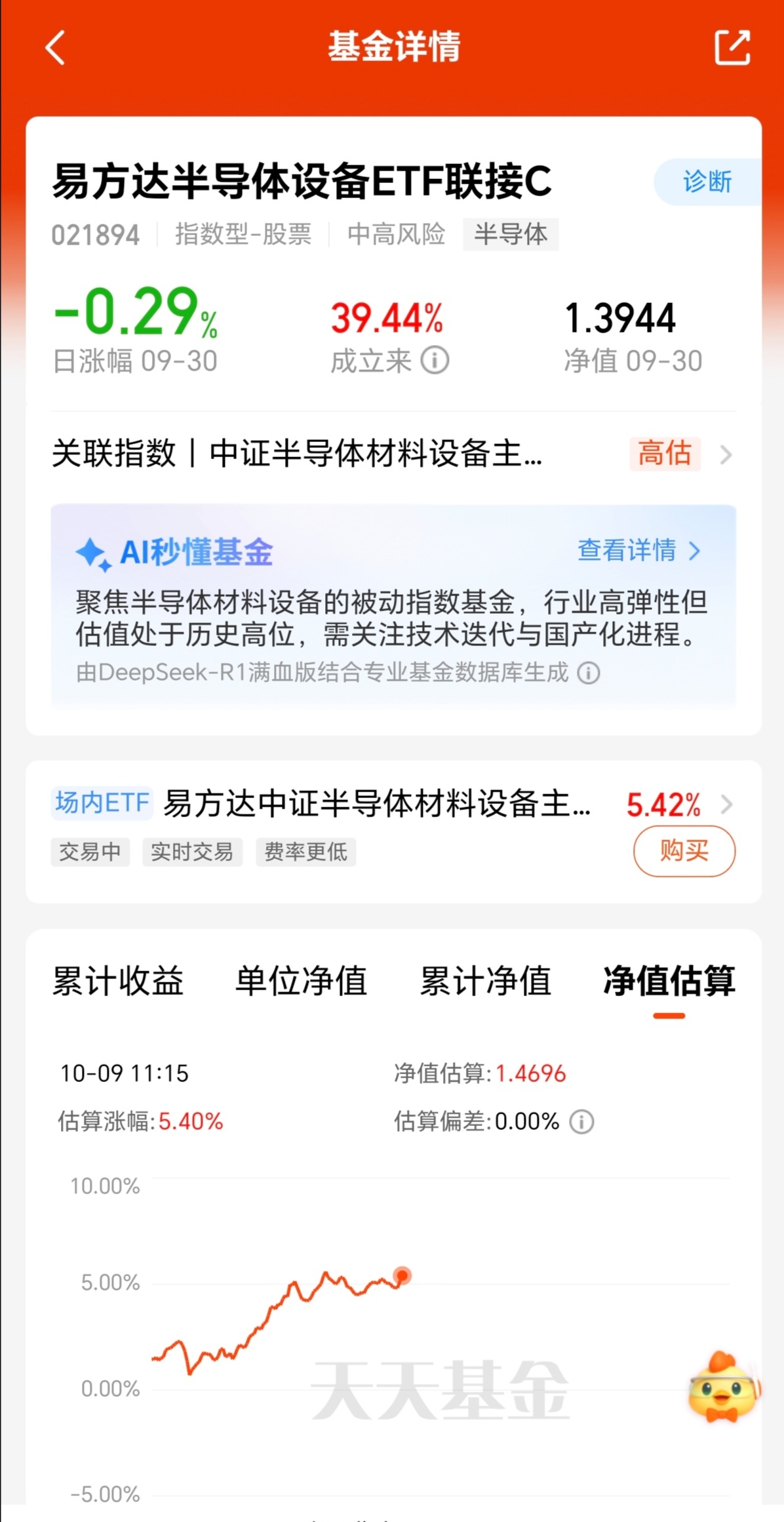 今日市场迎来开门红,科技赛道也再次吃肉,其中半导体设备近期趋势非常猛,我留意到的$易方达半导体设备ETF联接C(OTCFUND|021894)$近一个月涨幅超22%,在芯片板块中收益率,同时在国庆期间人工智能消息,也是利好不断,并且叠加海内外对算力的需求激增,半导体设备有望延续上涨趋势,我也准备慢慢定投起来,相信会有不错收获的!