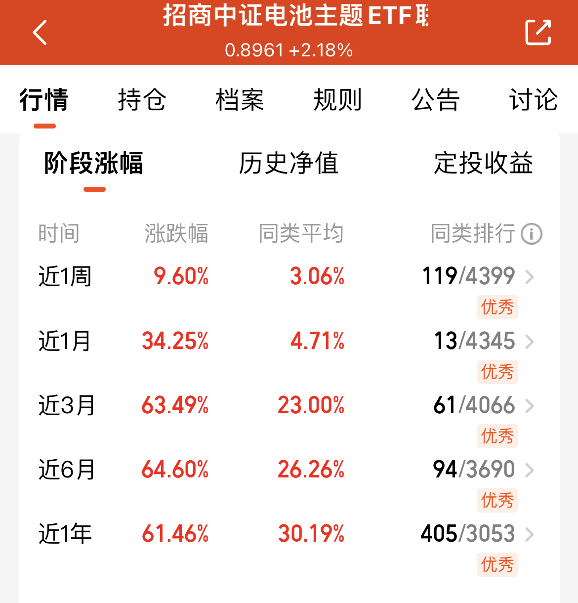 今日市场回暖,电池板块跟着发力,我也打算布局起来,逛了一圈发现$招商中证电池主题ETF联接C(OTCFUND|016020)$表现出色,这只基金业绩太能打,近一个月涨34.25%,近三个月飙63.49%,各阶段都大幅跑赢同类。