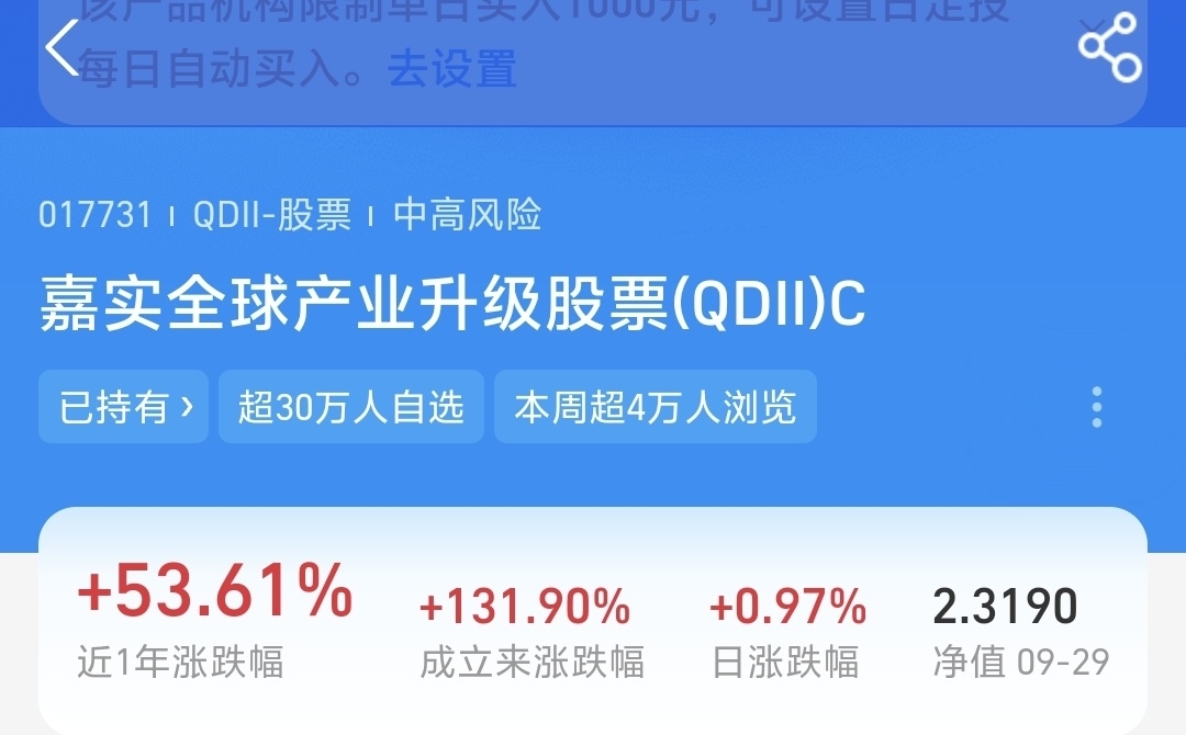 大A和美股最近行情火爆,涨得停不下来。$嘉实全球产业升级股票发起式(QDII)C$ 昨天净值涨了0.97%,近一年上涨53.61%,成绩亮眼,今天大概率能继续盈利。它盯着Al、半导体等全球产业升级赛道,选了英伟达、中芯国际这些优质标的,我特别看好它的未来。