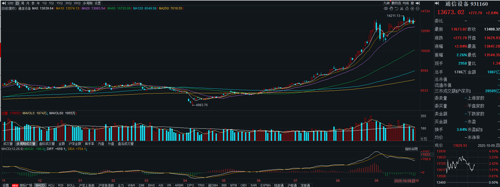通信设备震荡走强,指数涨超1%,但通信设备短期被10日均线压制,行情稍微弱势一些,短期没有做加法的计划,除非等日线重回10日均线支撑上方。