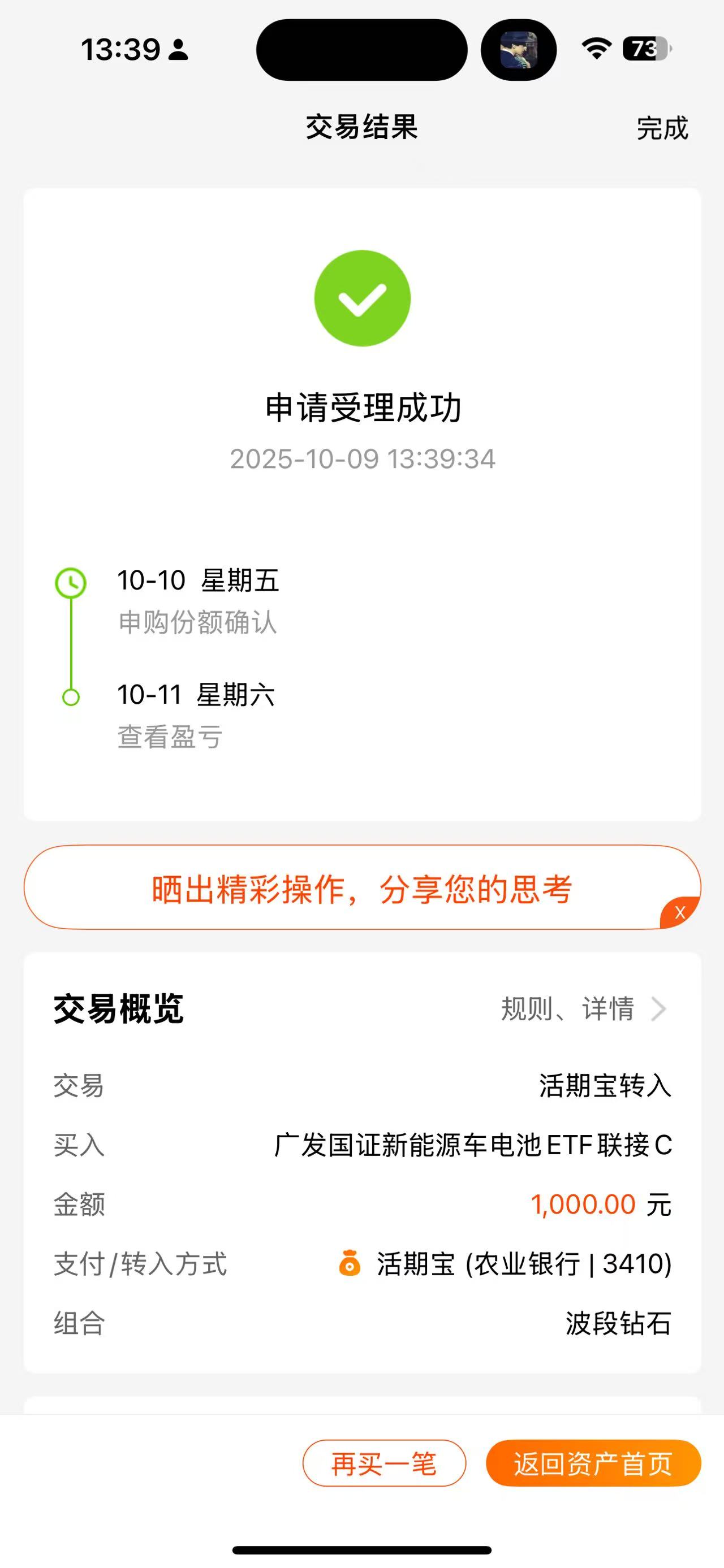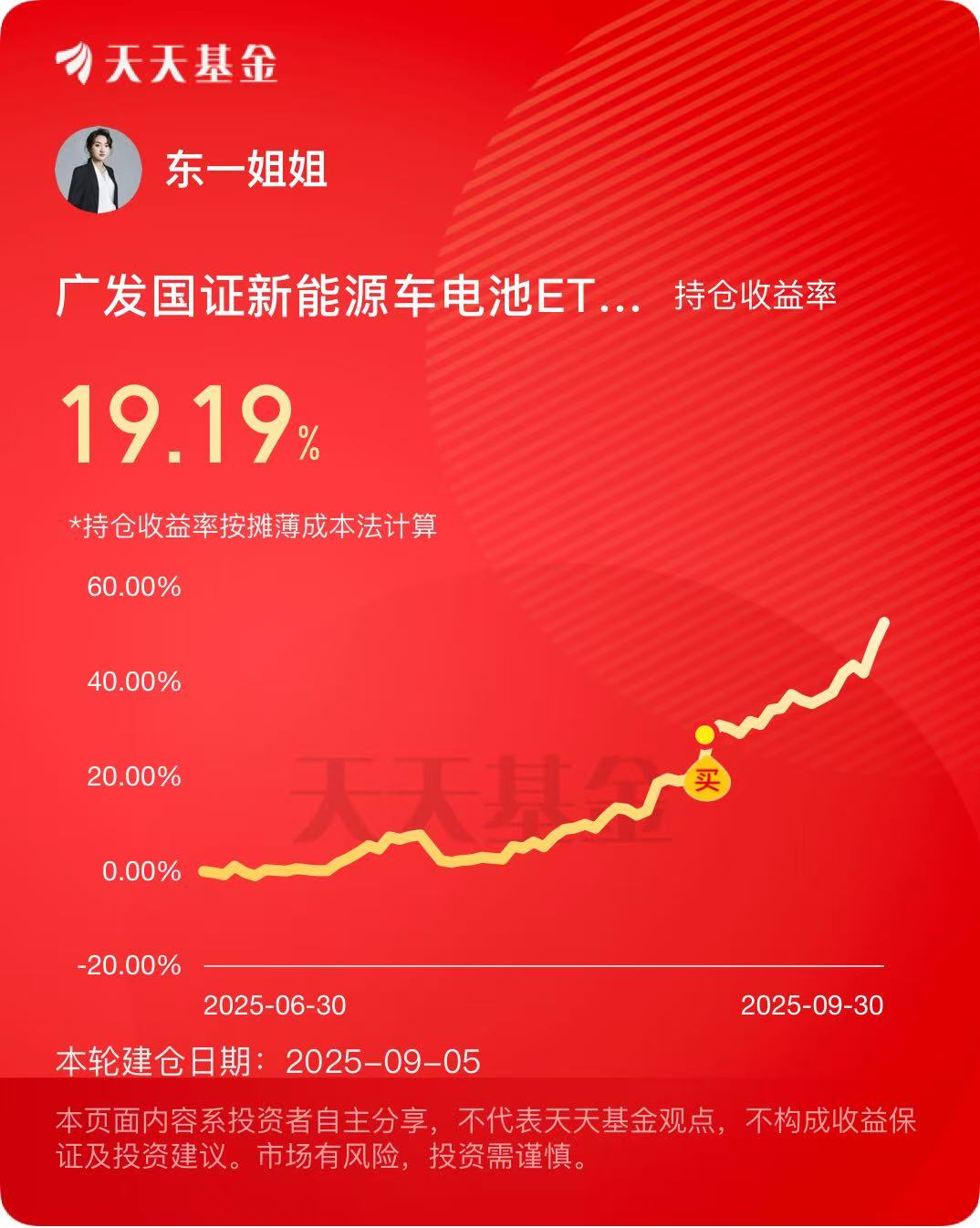 操作:顺势上车1000元$广发国证新能源车电池ETF联接C(OTCFUND|013180)$基金,这只基金跟踪的是新能电池,目前涨幅在3%左右,今日明显比CS电池的1.4%左右要高很多,这是因为它们成分股的区别,该基金最近1年涨幅高达60.75%,远远超过同类平均30.19%,我目前的持有收益已经超19%,我对这只基金的总体感觉还是很不错的,这只基金在天天基金热度排名榜上位居前五。