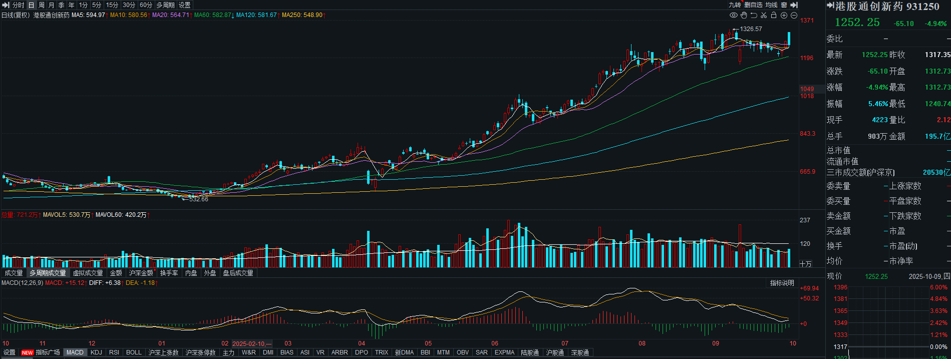 港股通创新药高开低走,盘中超跌5%,不过最低点在触及5日均线支撑之后,行情有回暖的迹象,当下多头趋势不变,所以我并不担心今日的回调,继续关注下方60日均线的支撑,只要行情在这个支撑上方,我就会继续格局。
