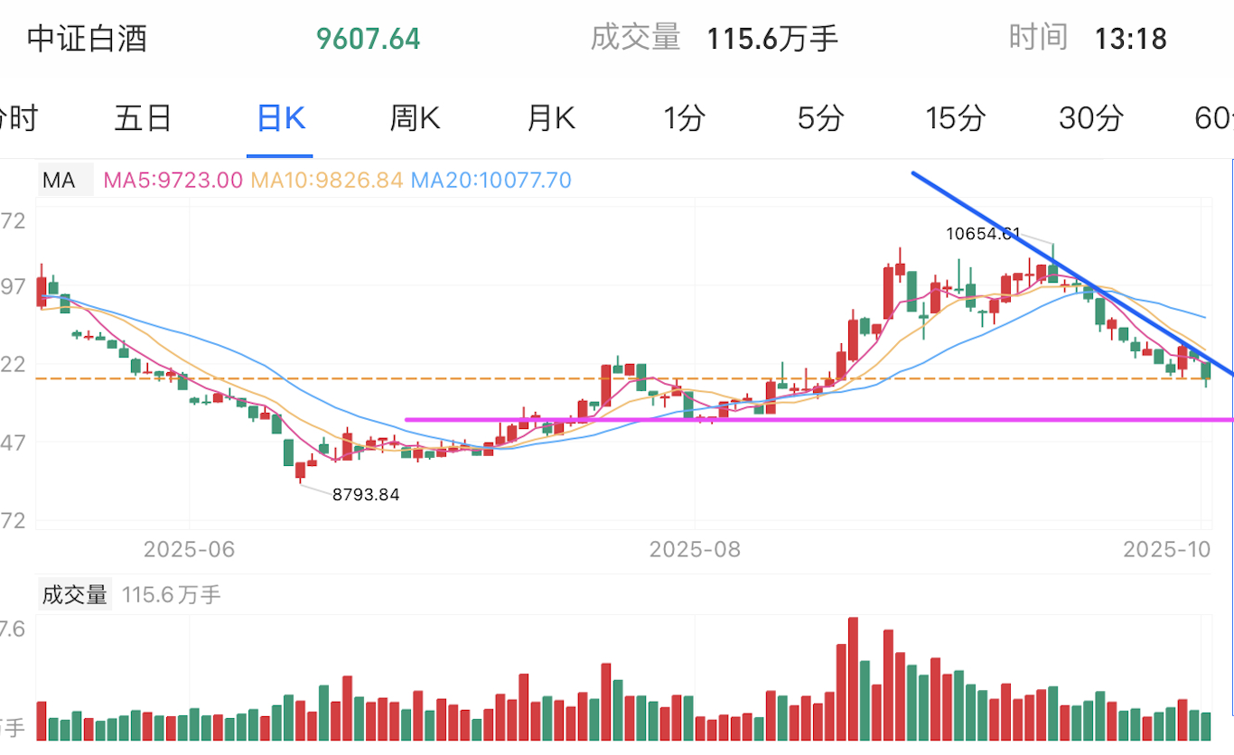 白酒此前在短暂反弹后很快回落,已经跌破前低支撑位,目前下行趋势,最近靠近下方支撑和最低点强支撑位。