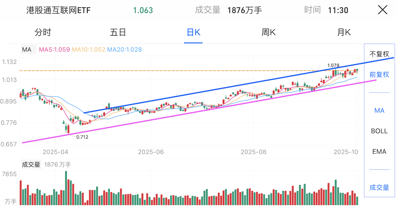 本人今日加仓1000元。随着美联储进入降息周期预期,全球流动性有望回流新兴市场,为港股带来资金支撑。同时,AI热潮持续升温,腾讯、阿里等互联网巨头加大AI投入,股价表现强劲。港股通互联网板块年内累计上涨超40%,显著领先纳斯达克等主要指数,当前估值仍具吸引力。技术面上,该板块在低位长期盘整后,近日放量突破关键均线,趋势反转信号明显,行情有望延续。富国ETF重仓腾讯、美团、阿里等核心龙头,具备高弹性与成长潜力,本人看好后市,持续分批布局中。非投资建议。