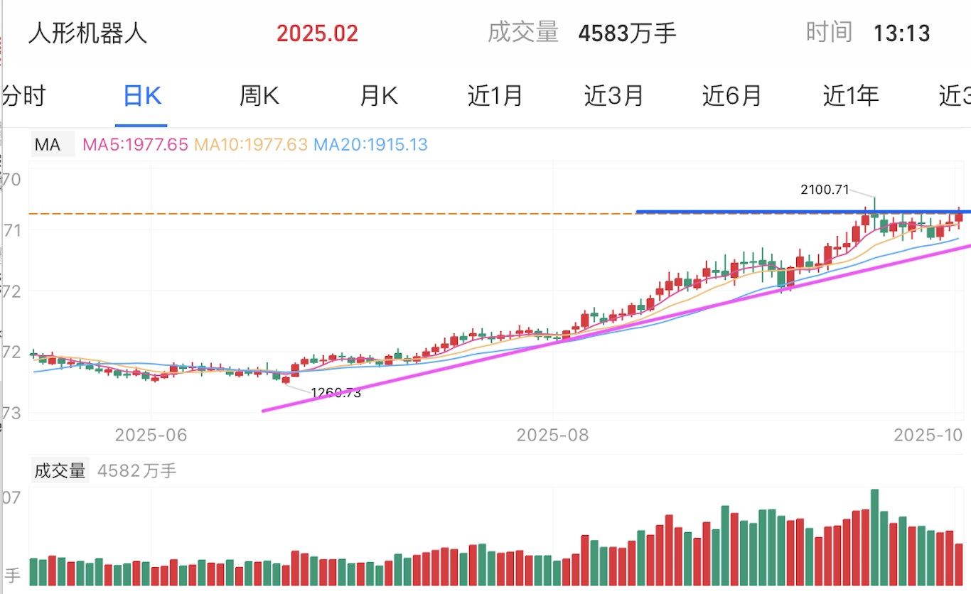 人形机器人近期震荡上行,短期大幅上涨后回落。这两日在上涨趋势线反弹,涨回压力位,突破才能继续上行,暂时还不确定。
