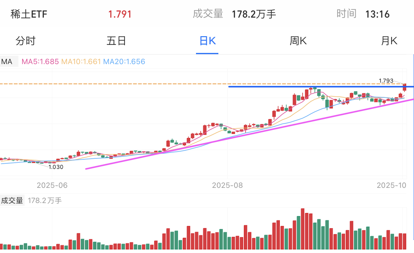 稀土近期有一波较大行情,后力竭回调,跌破上涨趋势线,短期进入盘整期。这两日突然飙升,突破压力位,有回升迹象,只是交易量一般。