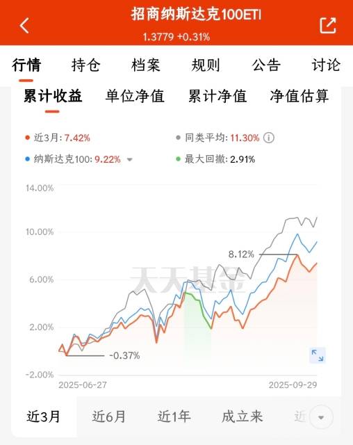 国庆假期,我们放假了,美股继续交易,节假日期间美股表现抢眼,纳斯达克100指数持续上涨,昨天更是上涨1.12%,再创新高。美联储降息降低科技企业融资成本,AI和云计算推动英伟达等成分股盈利增长预期。$招商纳斯达克100ETF发起式联接(QDII)C(OTCFUND|019548)$近半年涨幅23.31%,精准跟踪苹果、英伟达等科技巨头,长期收益稳定,未来发展潜力大,我打算分批加仓了。