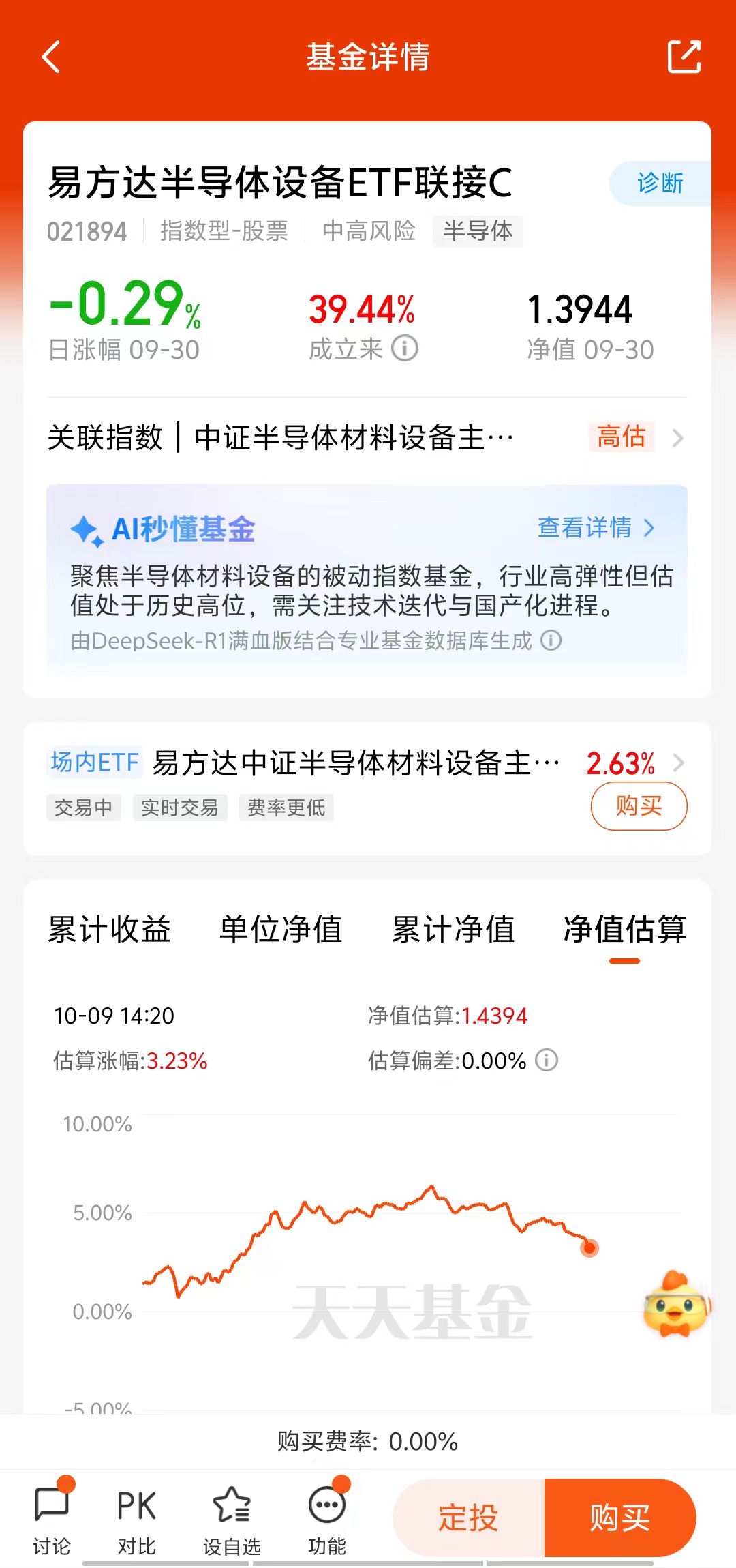 大盘今天涨了不少,半导体设备今天拉升上涨,最近趋势还是很猛的,$易方达半导体设备ETF联接C(OTCFUND|021894)$近一月涨了22.01%,近三个月涨了42.43%,国庆期间人工智能消息不断,海内外对算力需求激增,半导体设备就是最底层的支撑,看好这个方向,我今天先建个仓,之后再分批加仓了!