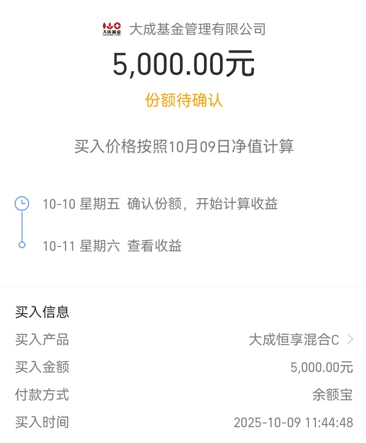 今天还是科技牛,继续科技为主线,刚好大成恒享持仓权益类大部分是科技类,大成恒享这支我持有不多,今天我继续加仓,9月底我开始布局的,持有体验感不错,经常有大蛋收,目前我持有收益也有1.61%,恒享是一只高波固收+,所以波动相比纯债、低波混债是会大得多,但同样收得也多,考虑到市场板块轮动快,单一板块波动比混债也大得多,所以我还是选择配置混债稳妥一些。