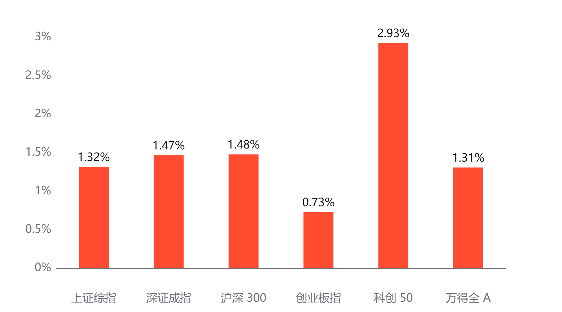 截至今日收盘,市场各主要指数普遍上涨。上证综指收3933.97点,上涨1.32%;深证成指收13725.56点,上涨1.47%;沪深300上涨1.48%,创业板指上涨0.73%,科创50上涨2.93%,万得全A上涨1.31%。