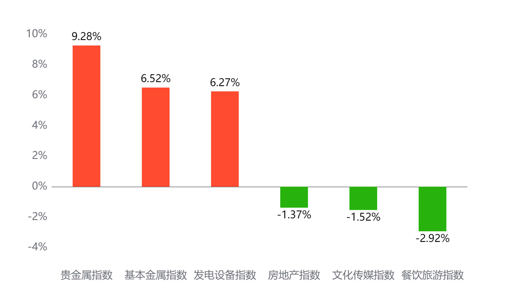 今天表现最好的主题概念依次为贵金属、基本金属、发电设备,表现最差的依次为房地产、文化传媒、餐饮旅游。