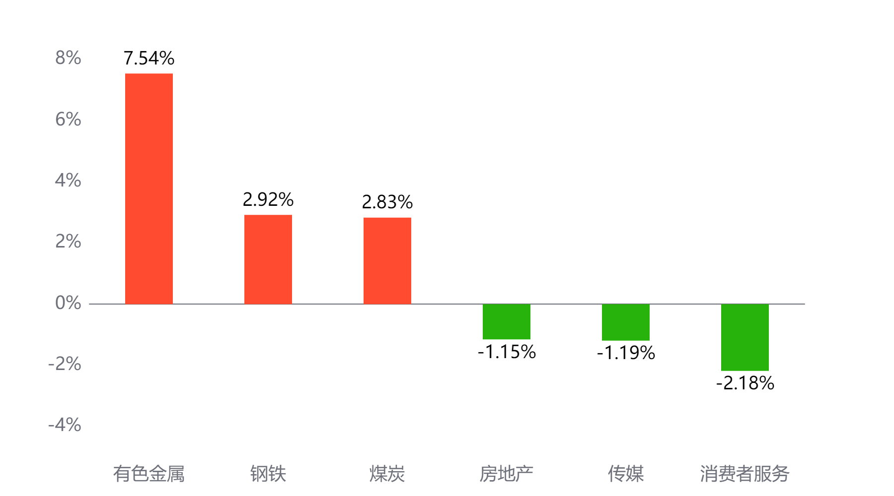 今天表现最好的行业板块依次为有色金属、钢铁、煤炭,表现最差的依次为房地产、传媒、消费者服务。