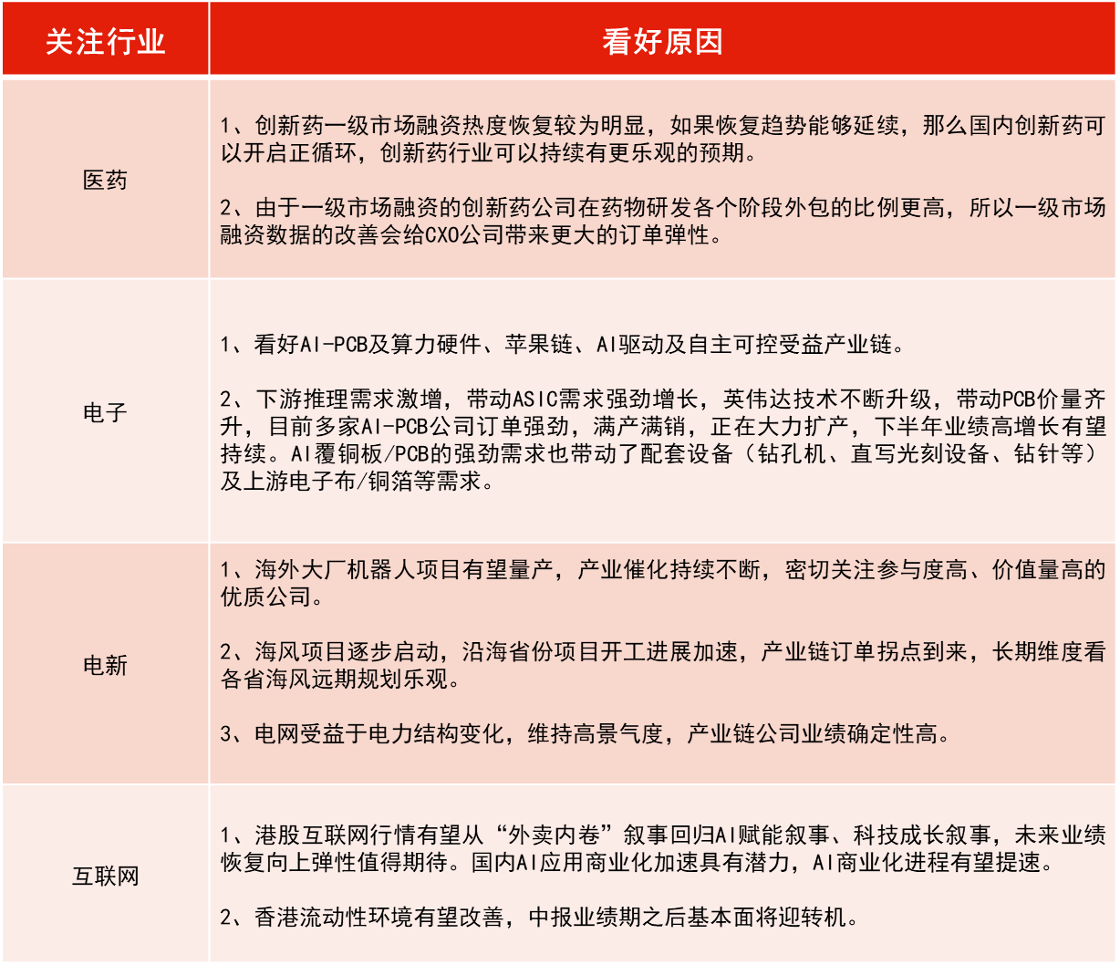 展望四季度,在宏观缺乏强支撑和流动性充沛的大背景下,仍然维持港股以结构性为主的判断,原因在于宏观政策更倾向于有限发力以及科技和新消费等局部拉动,都使得信用周期不致再度收缩但也难以转化为全局性修复。此外,缺少宏观主线或意味着上市公司盈利增长修复偏慢,市场中枢上移依然需要依靠股权风险溢价下行和流动性的支撑,因此主题轮动可能加快,稀缺的景气方向可能受到市场的一致性追捧。当前中国经济整体仍需修复但有结构亮点的宏观与市场环境,都更有利于港股,原因是无论提供稳定回报的分红、还是作为结构性机会主线的AI科技、新消费、甚至创新药,港股上市公司结构都相对更具优势。同时,国内过剩的流动性但又缺乏好的资产的矛盾,也推动南向资金不断涌入。另一方面,后续市场仍要回归企业盈利的修复,企业盈利全面改善的抓手还是财政政策的有效发力和信用周期的逆转向上。