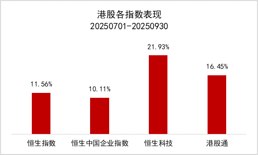 港股三季度在震荡中上涨,但向上弹性弱于A股,科技方向表现领先。今年以来AH溢价较低,港币流动性收紧,港股流动性缩紧,导致港股三季度表现弱于A股。三季度联储开启降息后,港股受益于宽松的美元流动性环境,在弱美元的大趋势下,港股整体维持向上趋势,市场继续对中美政策经济政策保持关注,包括联储降息及国内财政政策等。南下资金持续净流入,主力布局互联网头部企业等估值合理的优质蓝筹,AI浪潮的产业趋势持续演绎,恒生科技指数涨幅领先。