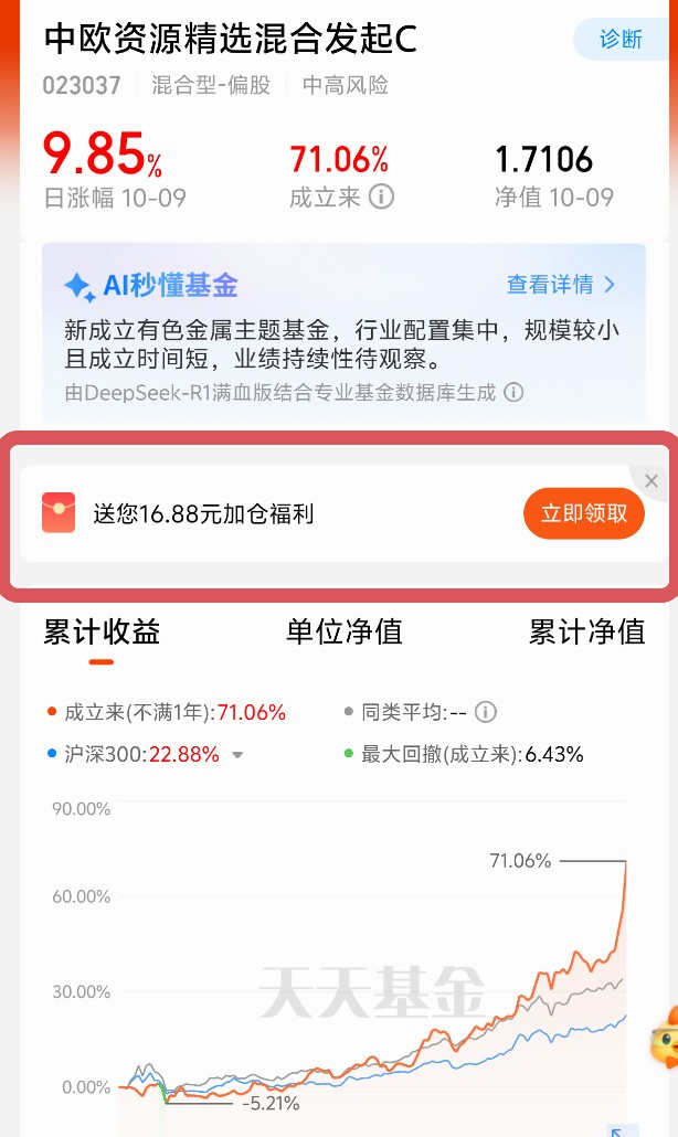 今天行情真是太给力了,十月开门红,在各大利好的加持下,有色金属板块大爆发!$中欧资源精选混合发起C$ 中欧资源精选混合今天大涨9.85%,接近10%的涨幅,表现非常优秀,这个主动基真是没得说,经理的操作也非常优秀,成立以来涨幅71.6%,优秀!!现在还用16.88红包用,很不错哦!