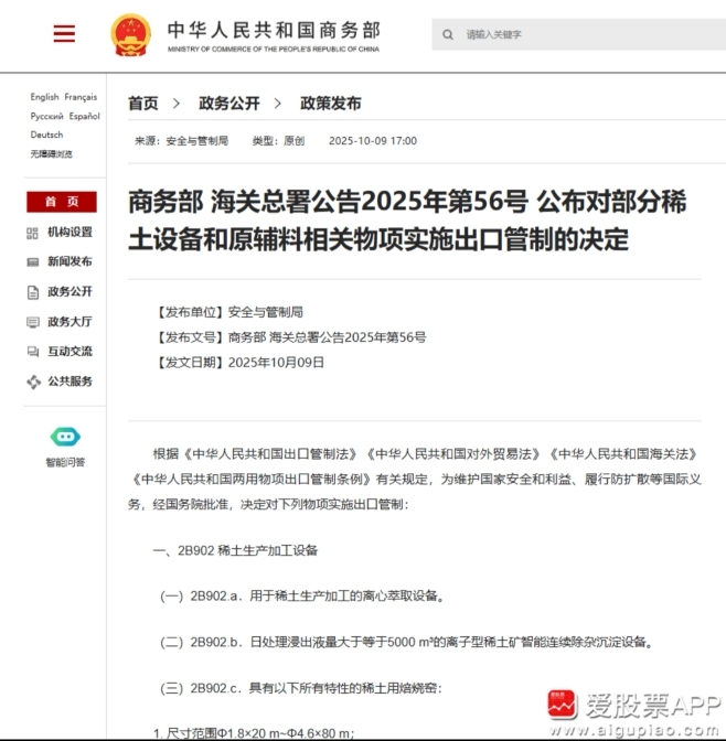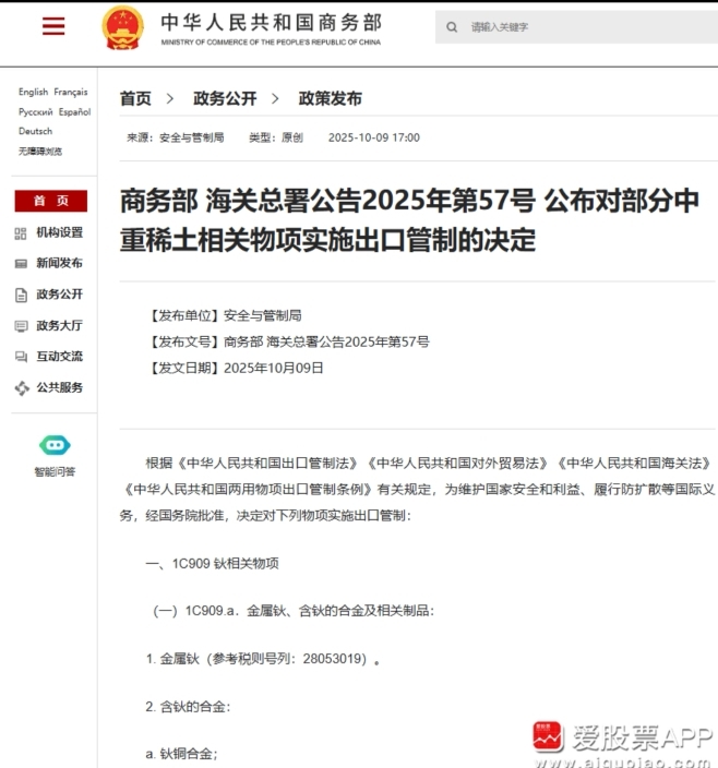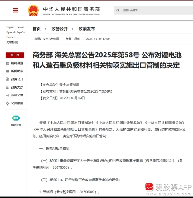[置顶]【涉超硬材料、稀土、锂电池等出口管制!商务部、海关总署连发4则公告】商务部、海关总署于2025年10月9日连发4则公告,对超硬材料、部分稀土设备和原辅料、部分中重稀土、锂电池和人造石墨负极材料等相关物项实施出口管制。管制物项包括人造金刚石微粉、稀土生产加工设备、稀土原辅料、中重稀土相关物项、锂电池和人造石墨负极材料等。(商务部)[17:05}