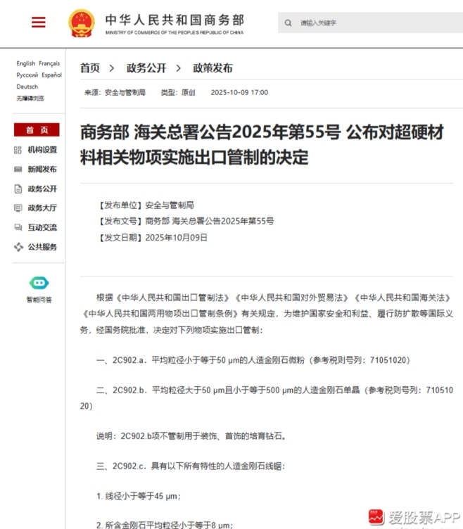【涉超硬材料、稀土、锂电池等出口管制!商务部、海关总署连发4则公告】商务部、海关