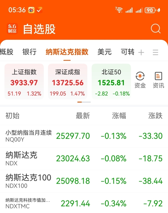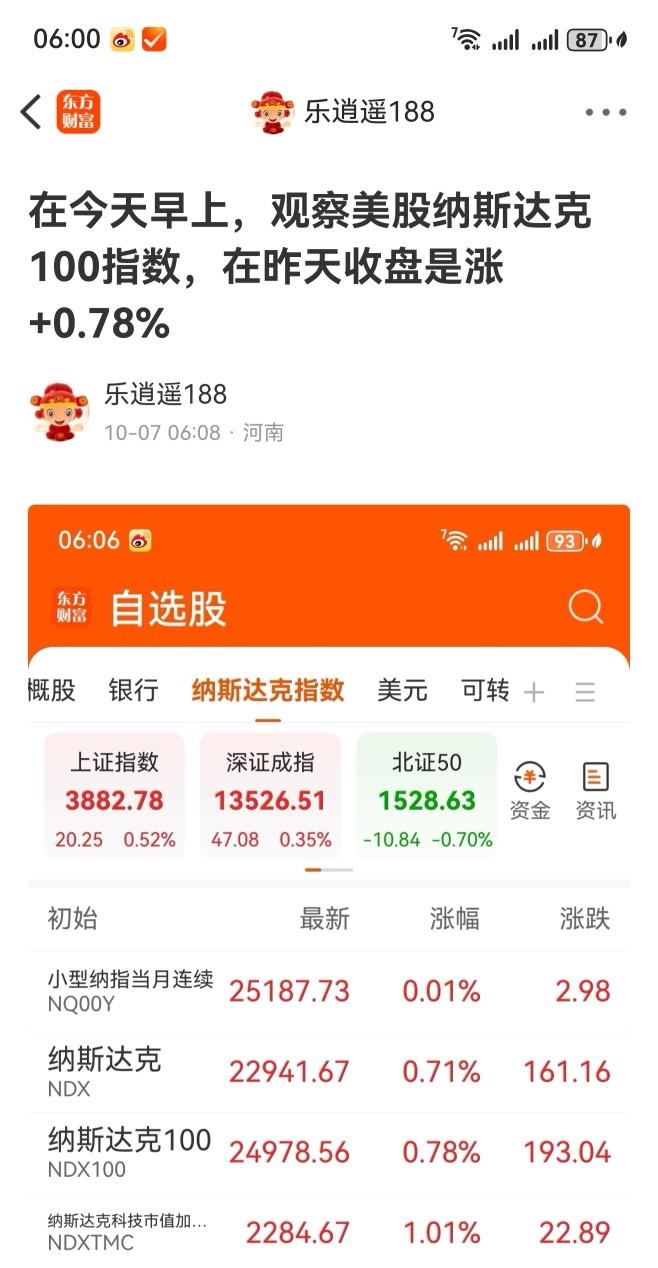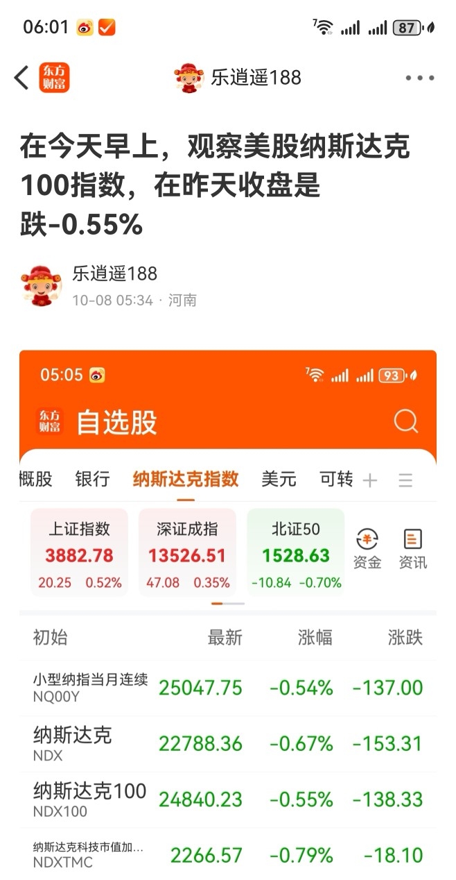 在今天早上,也提前观察观察了在10月2日早上至昨天周四早上,发的美股纳斯达克100指数从10月1日至10月8日那6个交易日涨跌数据。