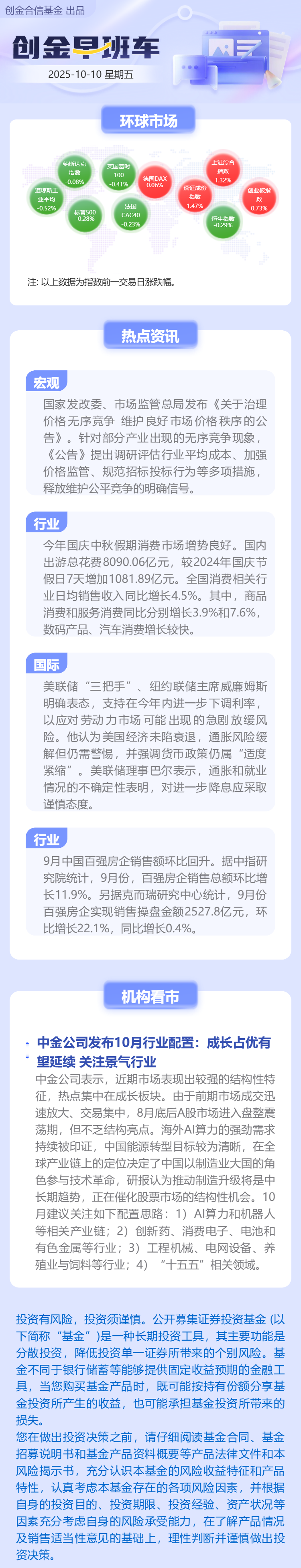 中金证券:近期市场结构性特征强,成长板块为热点。制造升级催股市结构性机会,10月可关注AI算力、创新药等多领域及“十五五”相关板块。