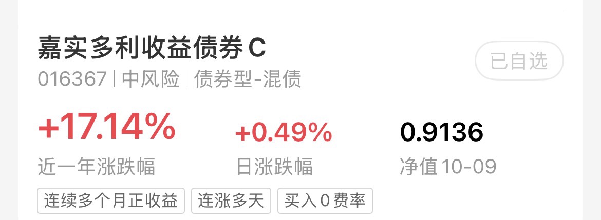 种草这支$嘉实多利收益债券C$这支昨天收蛋49个,近一年涨幅17.14%,总体比较比纯债香多了,采用固收+它主要持仓债券+一部分股票,具体持仓29.04%的利率债和22.7%的信用债,纯债打底平滑波动!另外持有18.15%的股票和29.61%的可转债来增强收益!业绩表现突出,目前股票市场牛市尚未过半,混债固收产品依旧比纯债性价比高,今天市场震荡就是不错的上车机会呀。