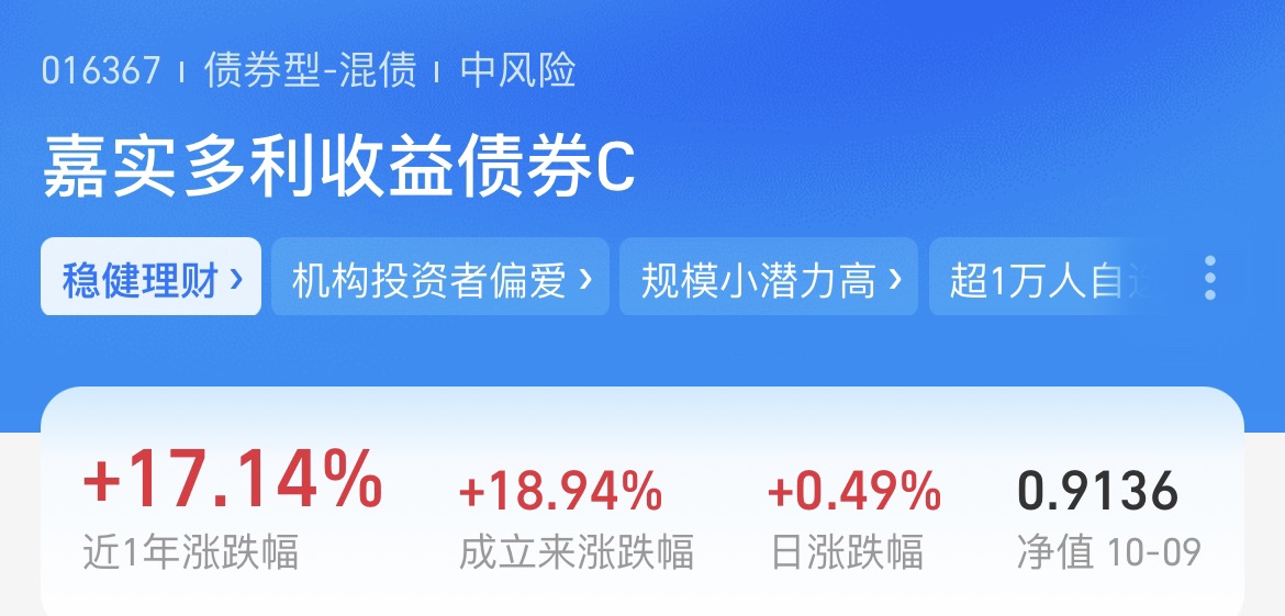 昨天股市走的太高了,今天开盘回落,盘中也没有拉升起来,感觉股市的风险还是比较大的。我关注的$嘉实多利收益债券C$ 表现就挺出色的,在业绩上面比较抗打,连续上涨3天,近一月收了277个蛋,近一年收益率达17.14%。中长期业绩在同类中比较靠前。该基金最大的亮点就是,债券打底,同时配置了20%以内股票占比,既可以控制风险,又可以博一博收益,这样不论哪一边行情向好都有机会,要是双边集体走强,机会就更多了。当前它规模较小,弹性也更大。期待它的后市表现了
