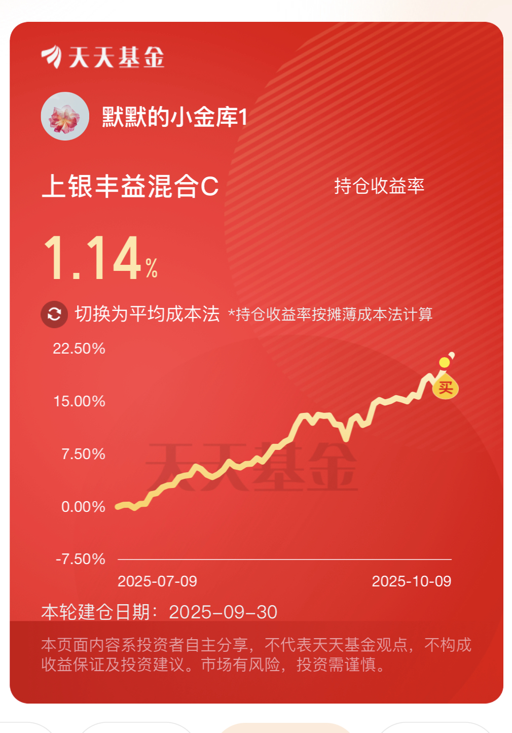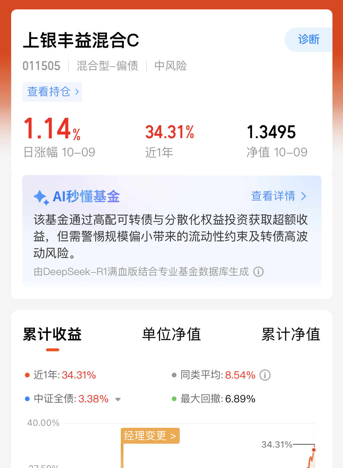 我手里的$上银丰益混合C(OTCFUND|011505)$昨天收了114个蛋,近一个月894个蛋,近三个月涨幅21.63%,大幅跑赢同类平均水平,进攻性比不少股基还要牛。之前拿它时就发现,涨得快还稳:行情好的时候跟得上节奏,回调时回撤又比同类小很多,哪怕偶尔跌一点,很快就能回正,弹性和抗跌性平衡得特别好。目前我的收益率1.14%,拿着也省心。