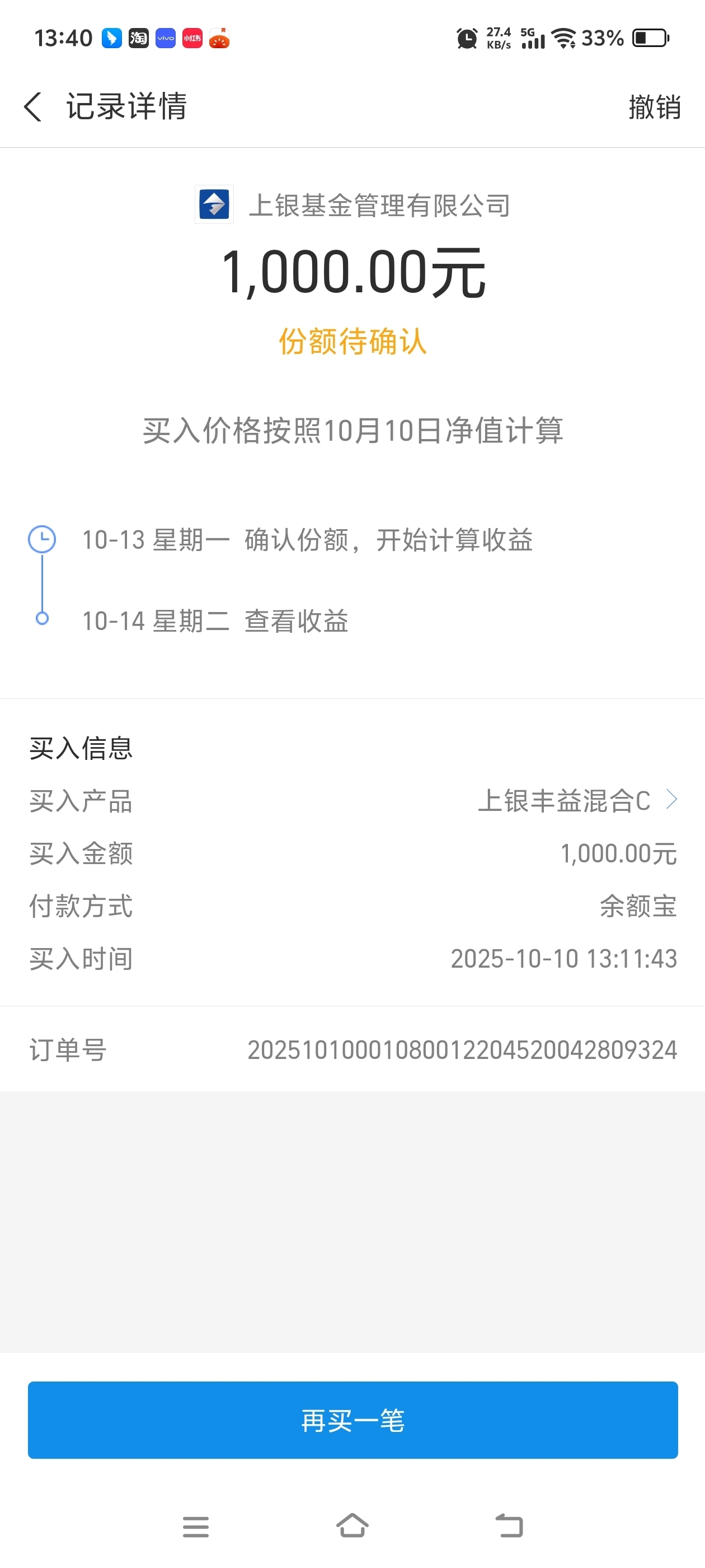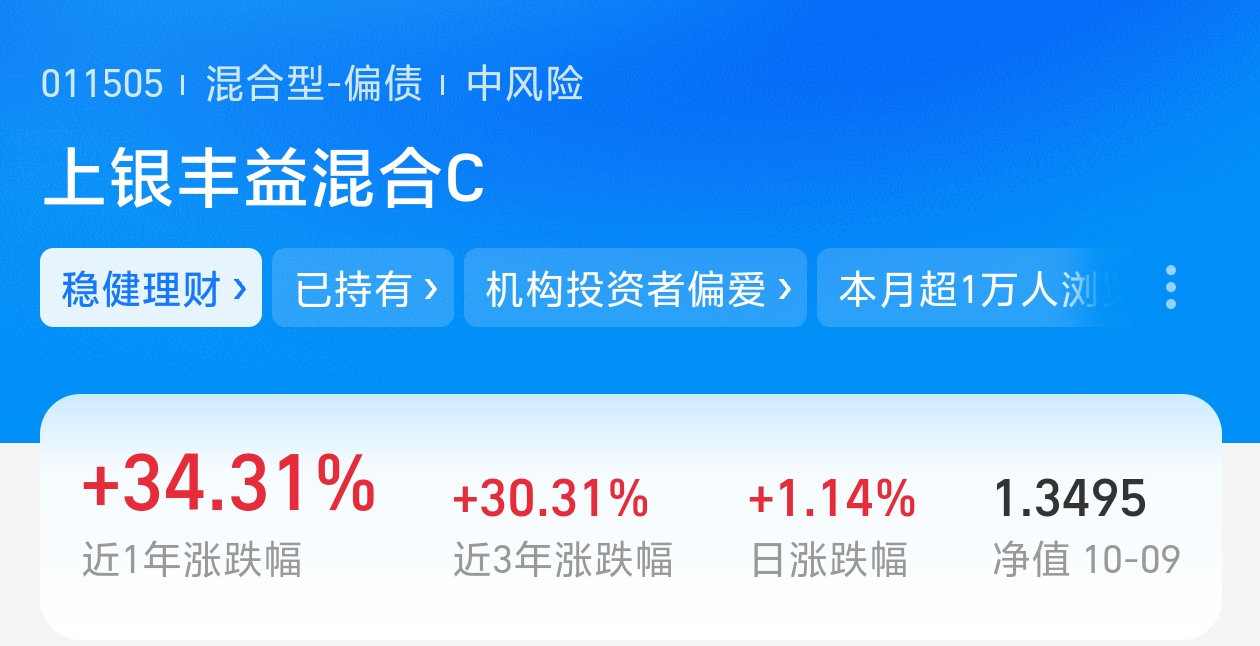 $上银丰益混合C$ 十月迎来开门红,沪指稳稳站上3900点,昨日股债双收,行情还是不错的。今天市场出现回踩调整,流星认为是健康的调整,深蹲是为了跳的更高!行情趋势向好,流星今天就继续加仓上银丰益混合C1000大洋,期待后市博取更高的收益!
