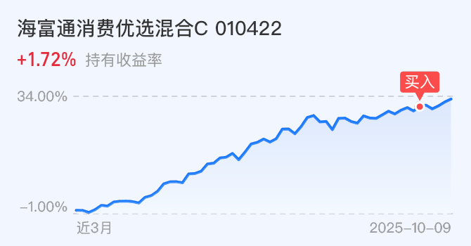 另外,节前布局的消费优选,这两天也持续上涨,假期的消费情况还是有一定正向刺激的。$海富通消费优选混合C(OTCFUND|010422)$