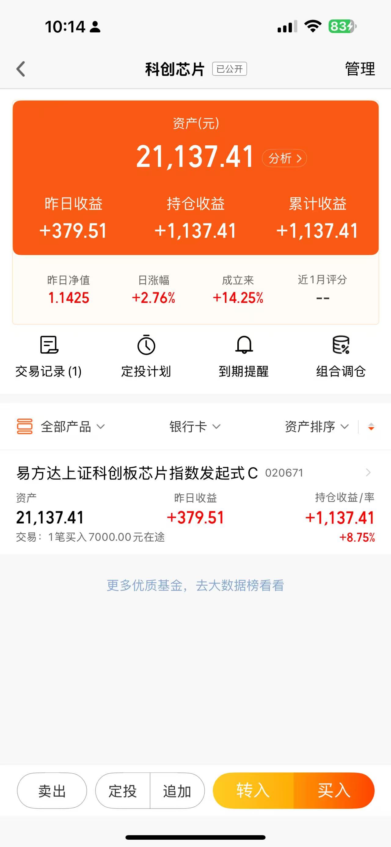 操作:大额加仓7000元$易方达上证科创板芯片指数发起式C(OTCFUND|020671)$基金,这已经是我第四次上车了,目前累计持仓20000元,前面都是节前布局的,目前有近9%的收益,所以今日的下跌,我不仅扛得住,我甚至觉得是一个做加法的好机会。今日科创芯片低开低走,盘中跌幅近5%,日K线下穿5日均线的支撑,技术面上回调到趋势线支撑附近,正是一个很好的补仓位置。