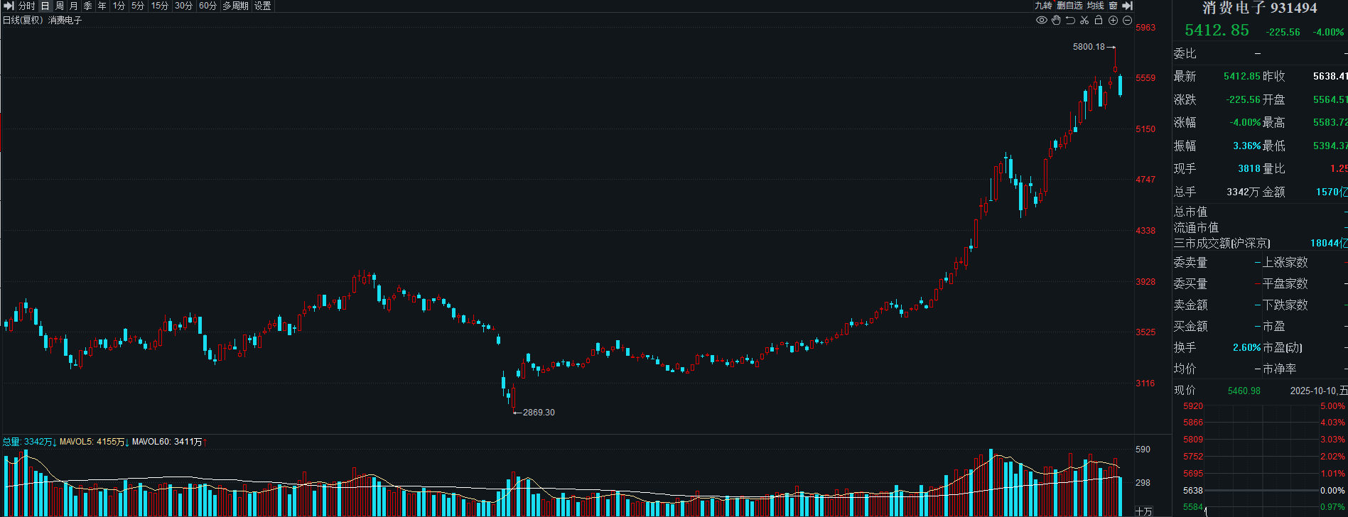 消费电子低开低走,指数超跌4%,技术面回踩10日均线的支撑,短期多头趋势还在,当下我还想再拿一拿。