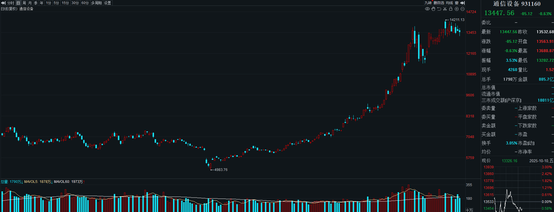 通信设备震荡走低,昨日我做了减法,但是我不知道你们看到没有,如果定叮了我的人,应该是看到了。通信设备震荡走低,指数回踩10日均线,附图MACD高位死叉向下,短期行情有继续回撤的风险,所以我今日尾盘如果跌的不多的话,我会继续做减法。