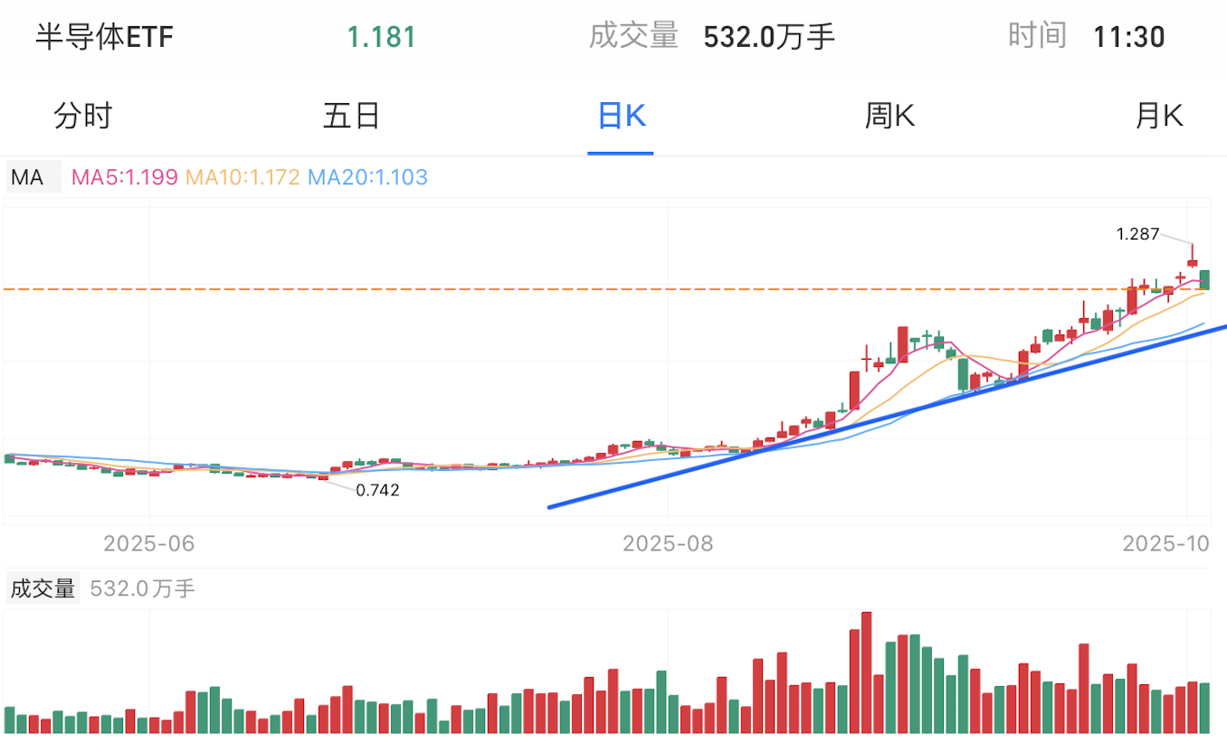 科创芯片近期有一波大行情,这几日在大幅飙升后回落,今日跌幅大,但没有跌破中长期上涨趋势线,因此还不确定短期盘整还是就此回调。